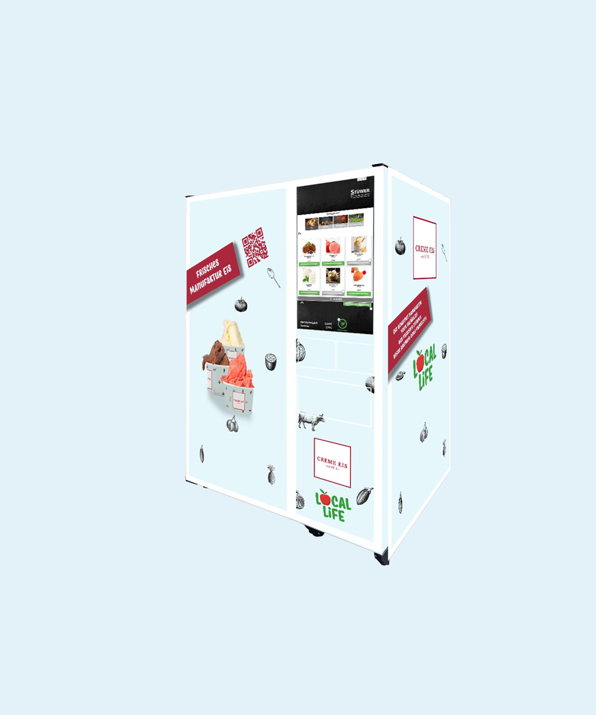 Unser Local Life Eis-Automat wird von der lokalen Eismanufaktur Crème Eis bestückt, die eine große Auswahl an hochwertigen Eissorten bietet. Das Eis ist in zwei Größen erhältlich:- Kleine Becher mit 140 ml- Große Becher mit 500 ml