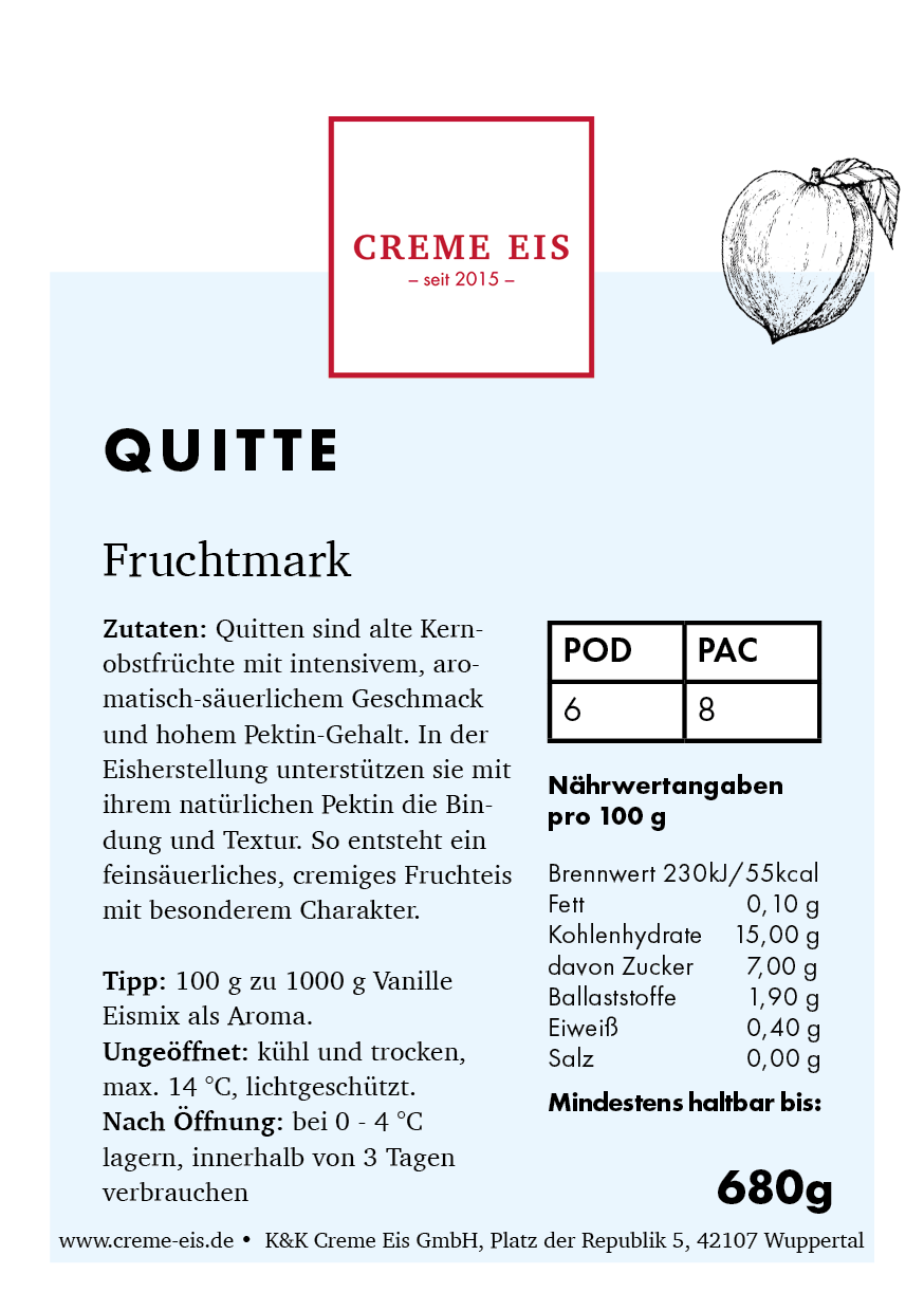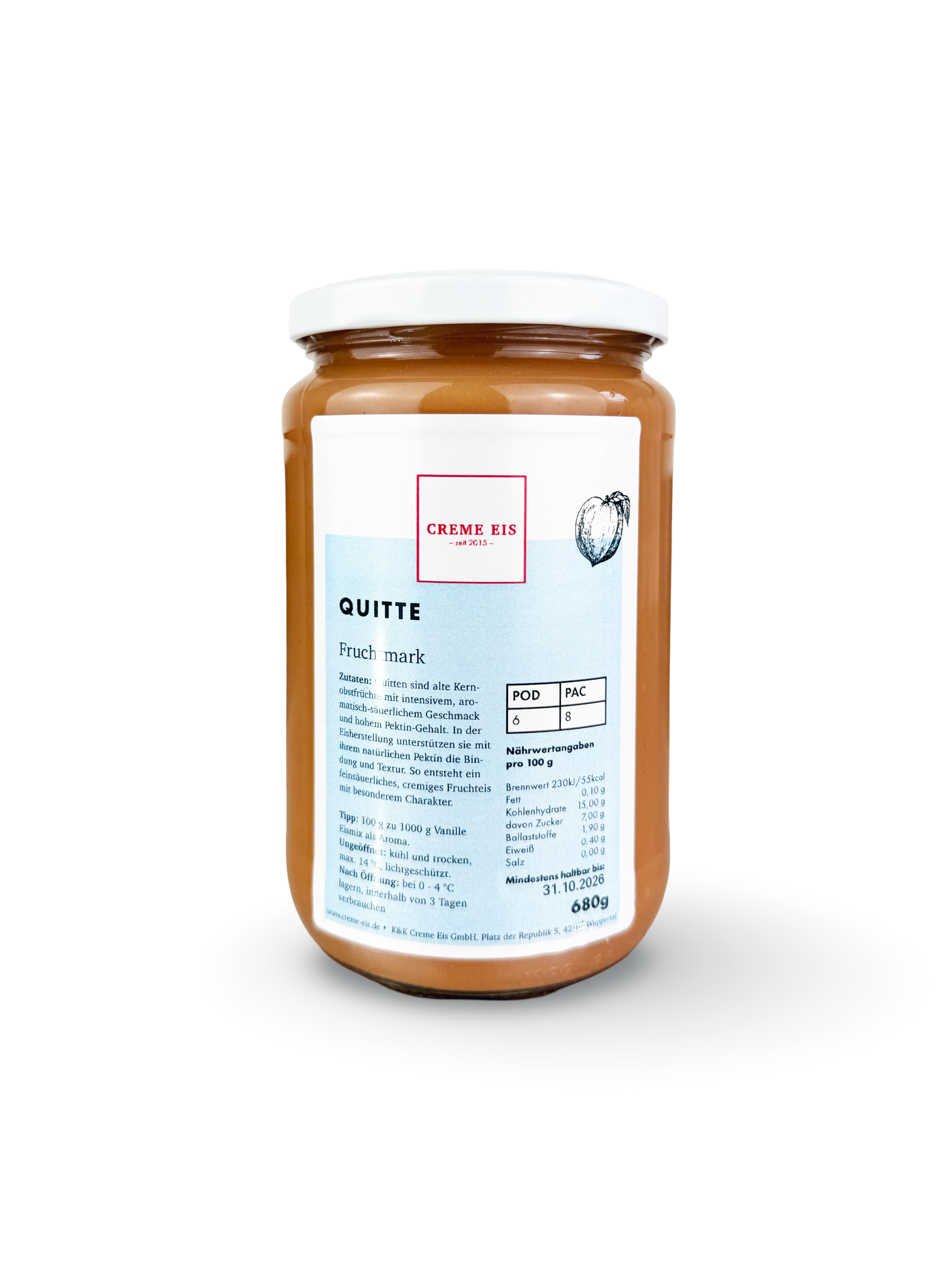 Quitten sind alte Kernobstfrüchte mit intensivem, aromatisch-säuerlichem Geschmack und hohem Pektin-Gehalt. In der Eisherstellung unterstützen sie mit ihrem natürlichen Pektin die Bindung und Textur. So entsteht ein feinsäuerliches, cremiges Fruchteis mit besonderem Charakter.